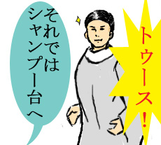 薬剤をつけた前髪がまとめられ、ツヤツヤの七三状態でしばらく待機。